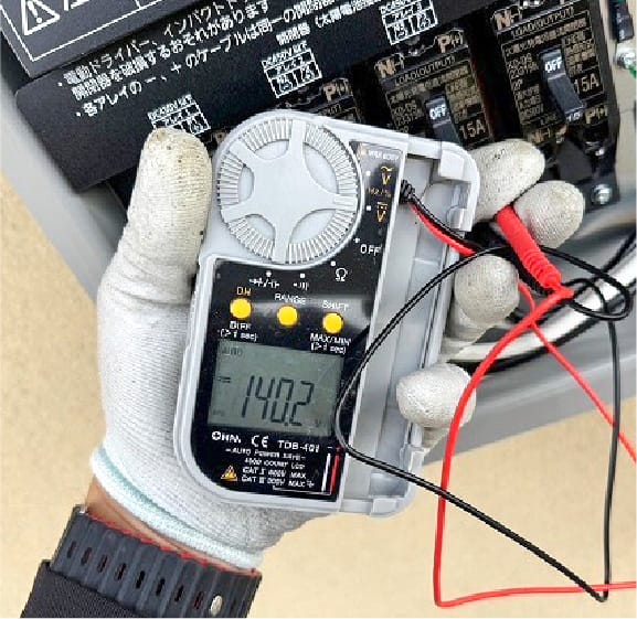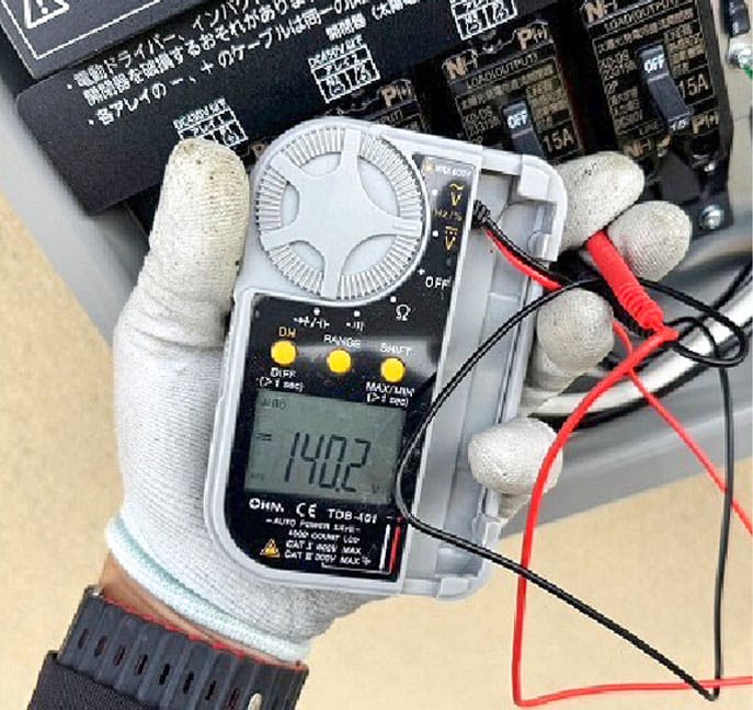 太陽電池モジュール測定専用機器、IVカーブトレーサーを使い、電流・電圧を計測します。回路毎の最大出力値を計測し、IVカーブという電力の波形を見る事により、開放電圧のみでは判りにくい発電状況の不具合を検知します。